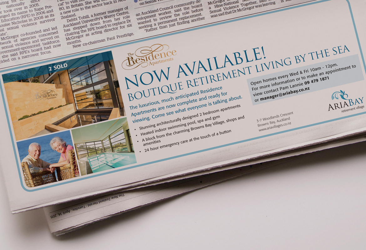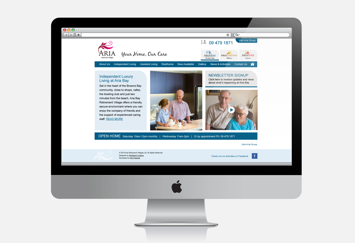 Aria Bay is a privately held retirement village. One of three, owned by Aria Villages. Redspark was engaged to build their brand and help promote sales of existing and newly built apartment units. Along with brochures, advertising, and other marketing collateral for Aria Bay, Aria Gardens and Aria Park villages, we also redesigned their websites. This comprehensive site for Aria Bay showcased the facility and allowed interested parties to explore and discover what life could be like in this beautiful retirement village. Part of the ongoing development of Aria Bay was revitalisation and rebranding of existing apartments, The Woodsides and Beach Road Apartments, plus branding of newly built The Residence Apartments.