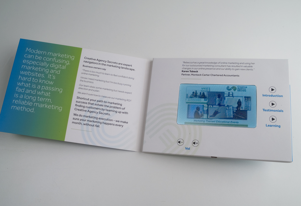 Creative Agency Secrets provide outsourced marketing services for clients who don’t have a marketing department. They wanted to rebrand to stay relevant and look more professional. Our clever logo design incorporates the initials C and A together forming the S. This symbol, for a marketing company also rep- resents an “unlocked” icon which portrays the unlocking of marketing secrets. We also designed their video brochure graphics.