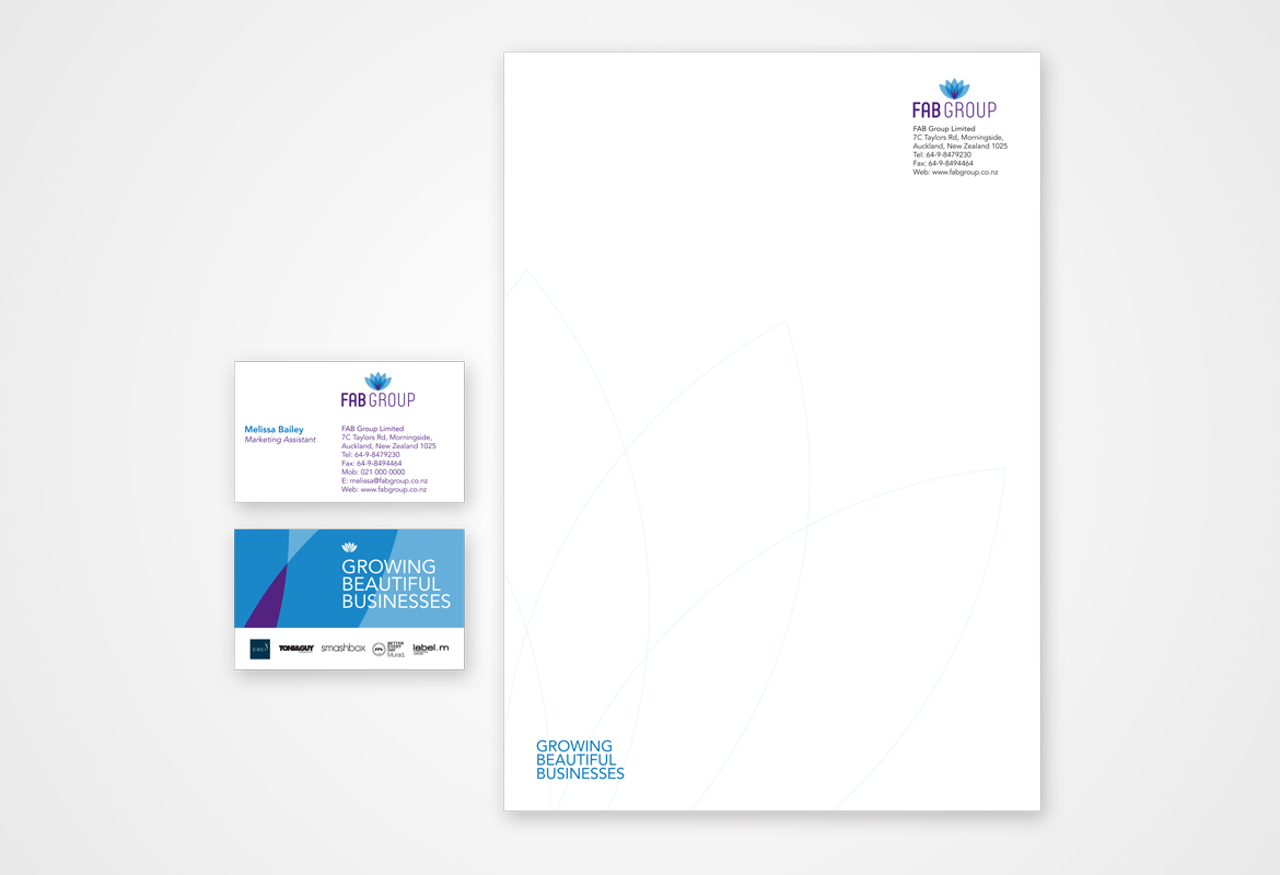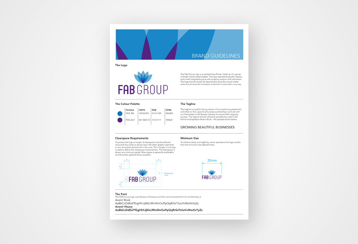 FAB Group was formerly named Micromode. They are the head franchisor for a number of beauty brands including Toni & Guy, Caci Clinic and Smashbox. They were looking to rebrand and position themselves as franchise specialists who provide leadership, credibility and mentoring for women's beauty franchisees. The new brand features a logo inspired by beauty and nature. The symbol is made up of multiple overlapping parts which is a nod to the business structure and it symbolises a flourishing business. We also designed a stationery suite, brand guidelines and office graphics for FAB Group.