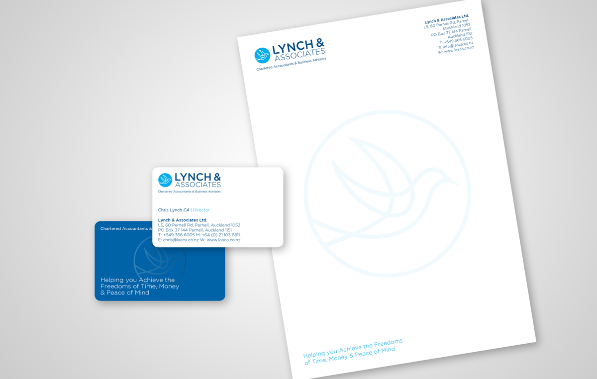 With the introduction of a new service offering and a major structural change, Lynch and Associated was born. They felt it was time for a new brand to reflect their new positioning and focus. They help businesses achieve the freedoms of time, money and peace of mind. The brand needed to reflect this and the clean simplicity of the logo with the bird in flight represent freedom and peace. We also designed stationery including business cards, letterhead and email signatures.