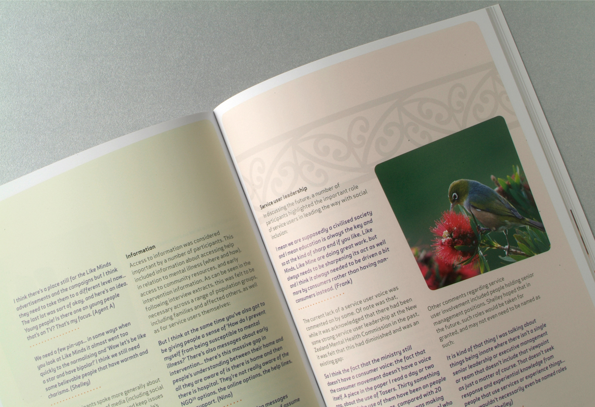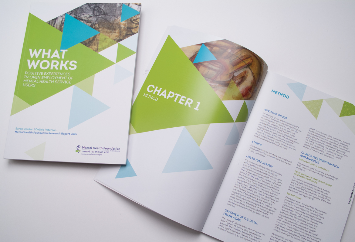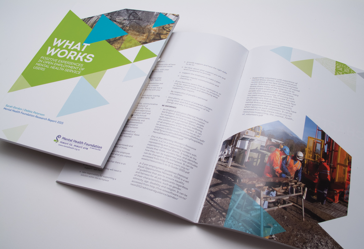 Mental Health Foundation regularly publish research reports. This resource which talks about positive experiences in employment of mental health service users was designed to appeal to a wide audience. It features a combination of a local artists work and workplace imagery. There is a distinctly New Zealand feel designed into the piece with the use of graphic elements, giving this 96 page book a warm, inviting, local feel.