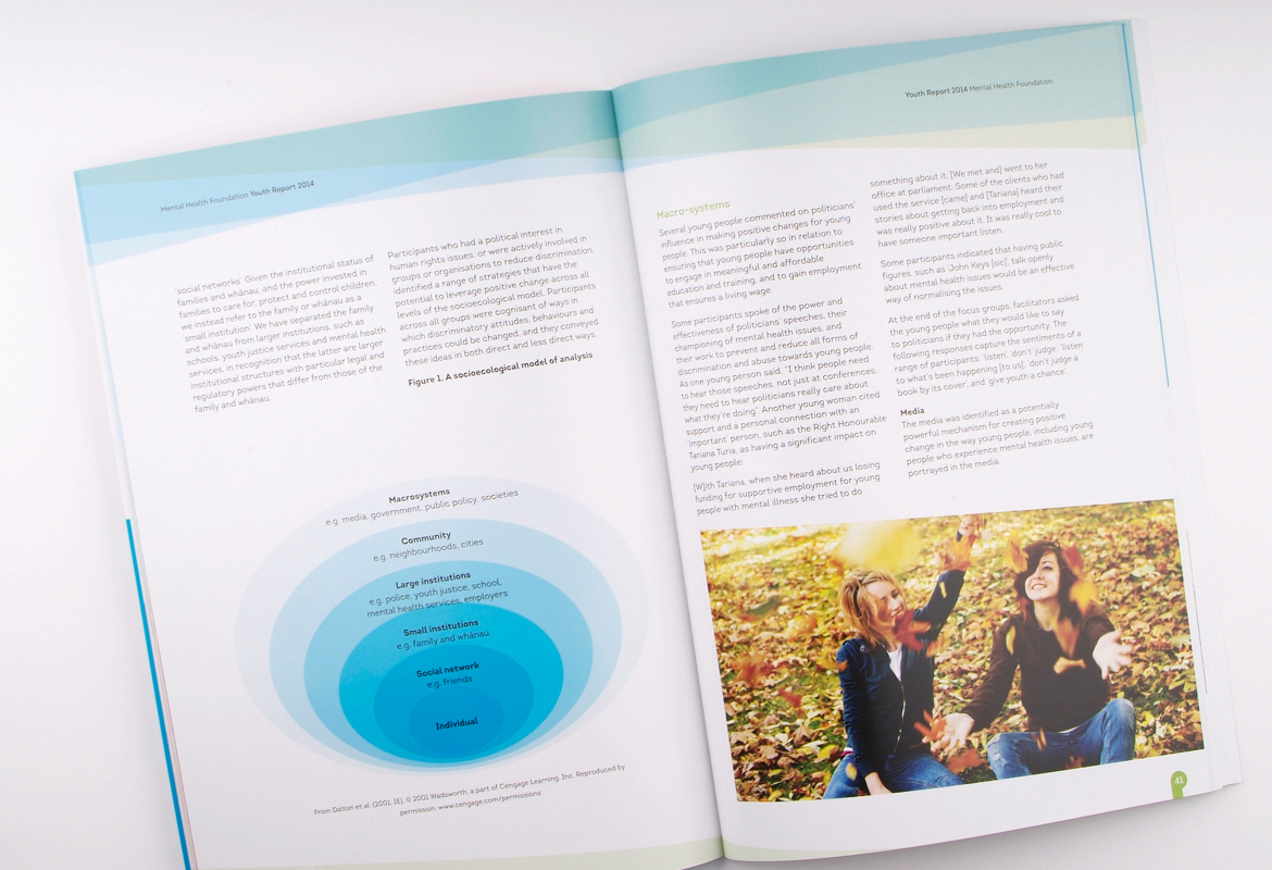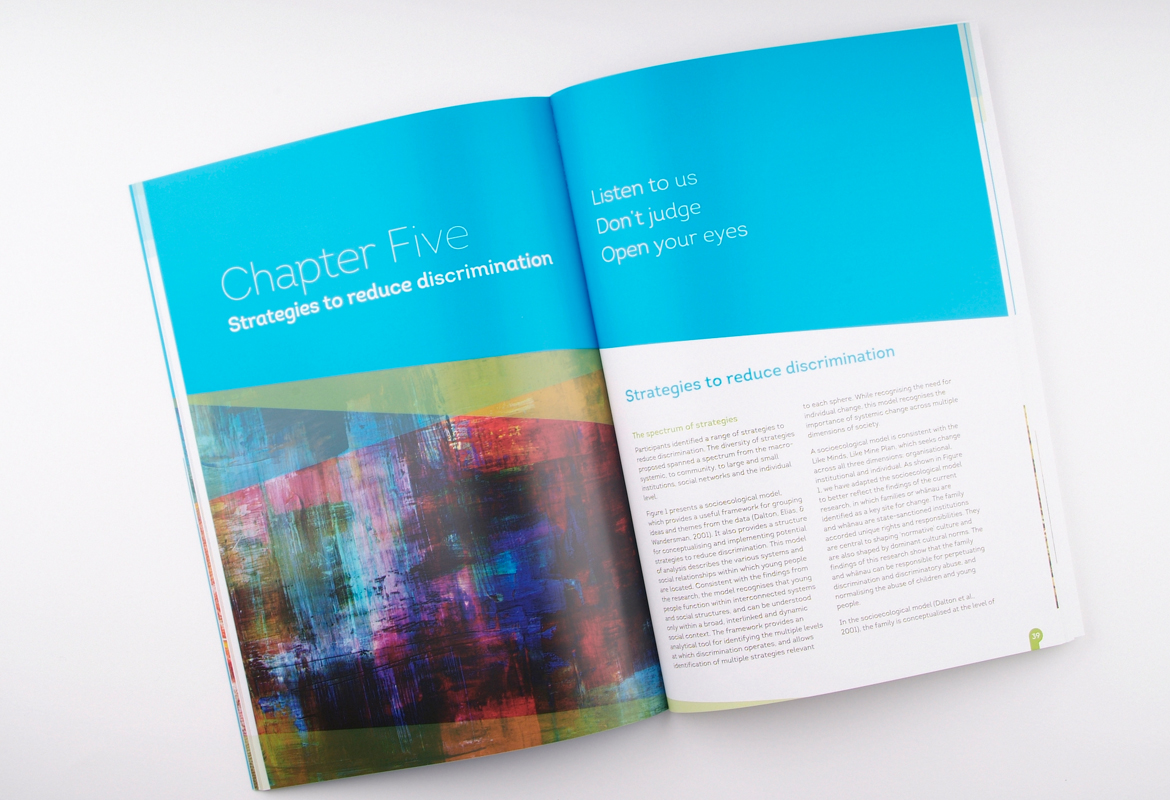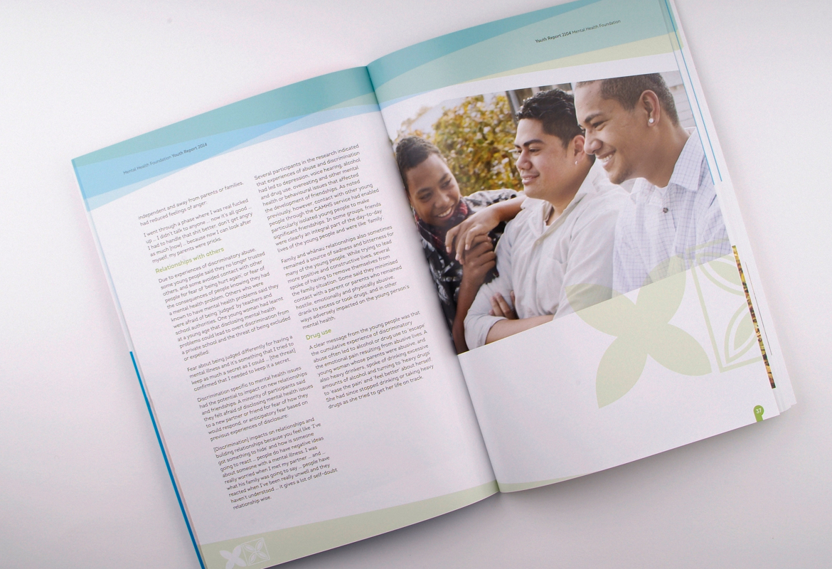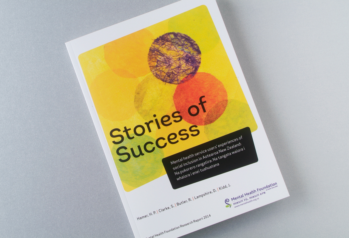 Mental Health Foundation regularly publish research reports. This resource which talks about positive experiences in employment of mental health service users was designed to appeal to a wide audience. It features a combination of a local artists work and workplace imagery. There is a distinctly New Zealand feel designed into the piece with the use of graphic elements, giving this 96 page book a warm, inviting, local feel.